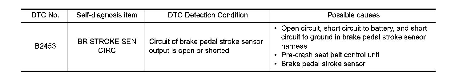 - There are 2 signals (brake pedal stroke sensor 1 and 2) sent from the brake pedal stroke sensor. Pre-crash seat belt control unit judges the stroke amount and the speed of the brake pedal according to the voltage of the signal sent by each side.