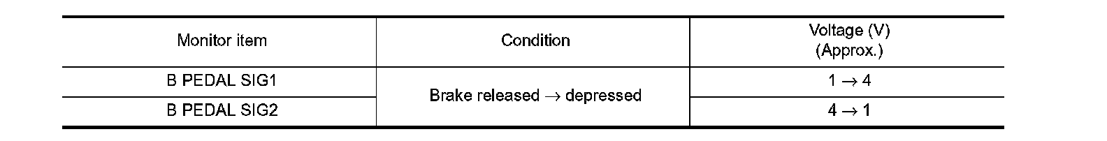 3. Check "B PEDAL SIG1" and "B PEDAL SIG2" indication under the following conditions.