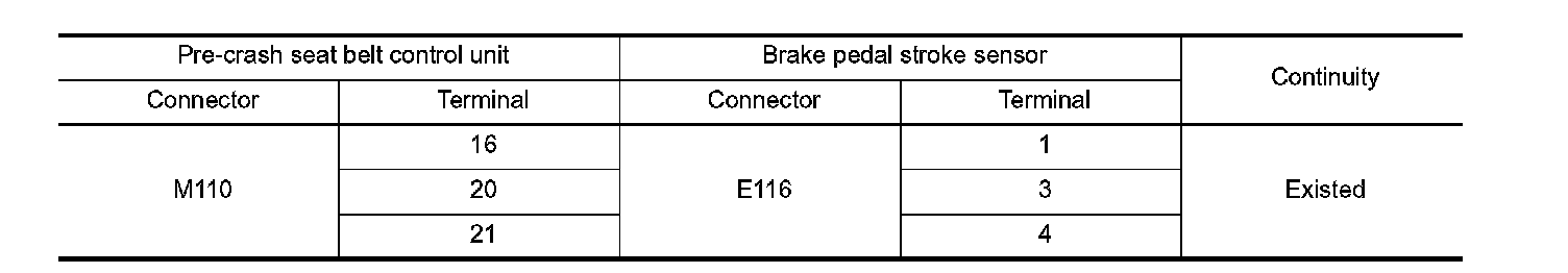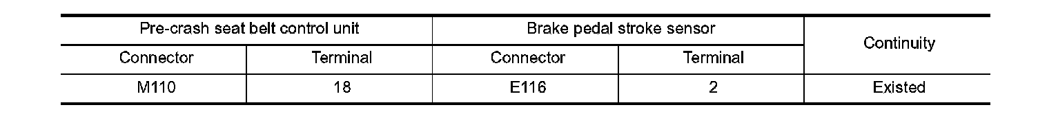 2. Check continuity between pre-crash seat belt control unit harness connector and brake pedal stroke sensor harness connector.