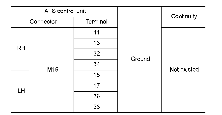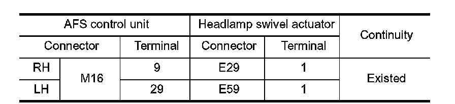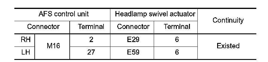 3. Check continuity between the AFS control unit harness connector and the headlamp swivel actuator harness connector.