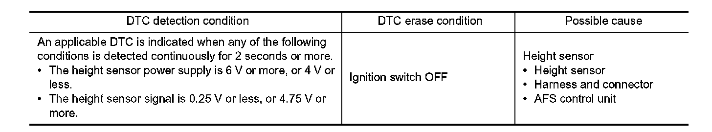 The height sensor is installed to the rear suspension arm. The height sensor detects the suspension arm displacement as the vehicle height change. The height sensor transmits the height sensor signal to AFS control unit.