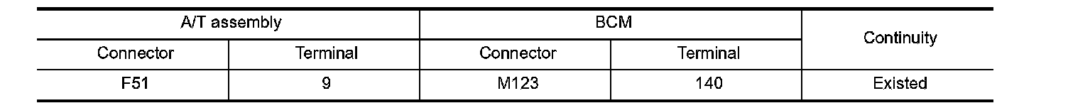 3. Check continuity between A/T assembly harness connector and BCM harness connector.