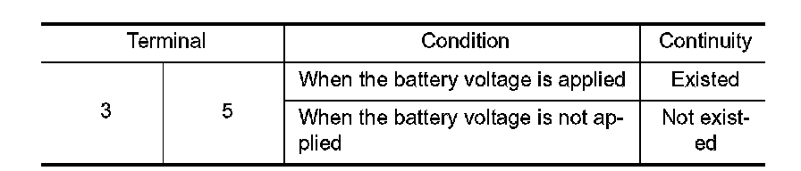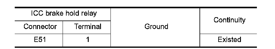 Apply battery voltage to ICC brake hold relay terminals 1 and 2, and then check for continuity under the following conditions.