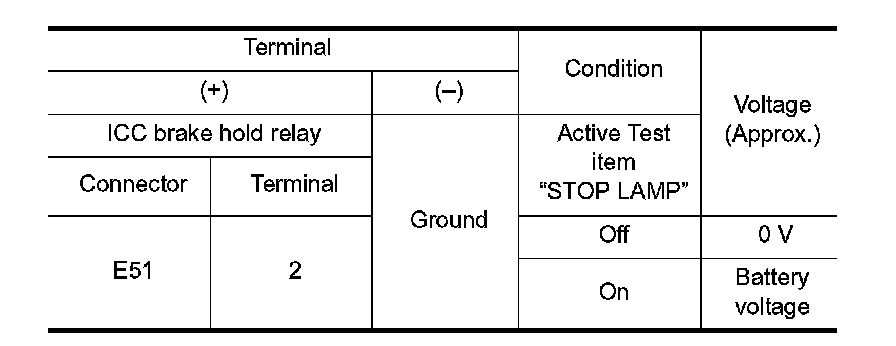 3. Perform "STOP LAMP" on "Active Test" of "ICC", and then check the voltage between ICC brake hold relay harness connector and ground.