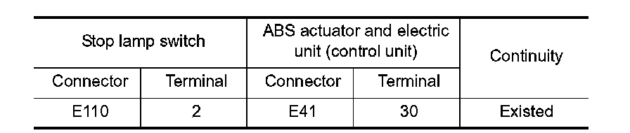 3. Check for continuity between stop lamp switch harness connector and ABS actuator and electric unit (control unit) harness connector.