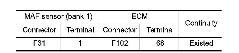 3. Check the continuity between mass air flow sensor (bank 1) harness connector and ECM harness connector.