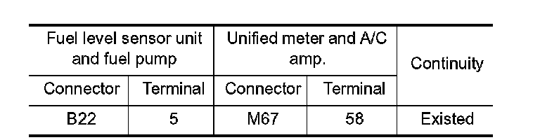 3. Check the continuity between "fuel level sensor unit and fuel pump" harness connector and "unified meter and A/C amp." harness connector.