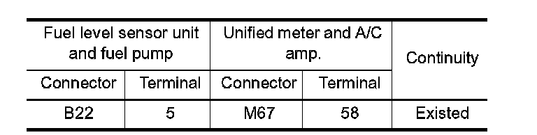 - Harness for open or short between "fuel level sensor unit and fuel pump" and "unified meter and A/C amp."