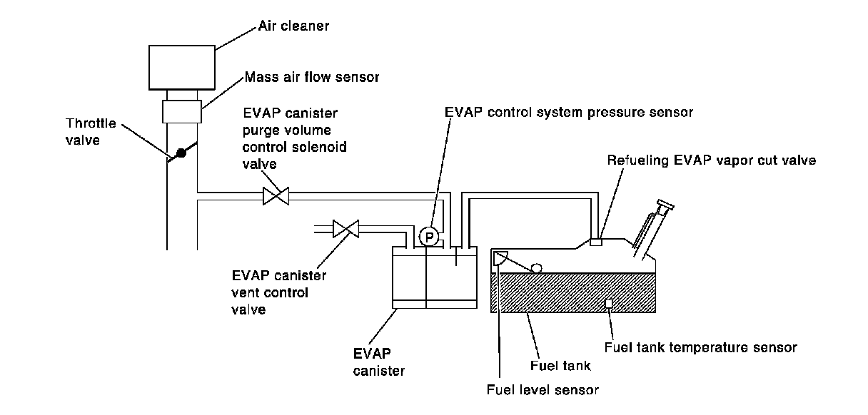 Check EVAP purge line (pipe, rubber tube, fuel tank and EVAP canister) for cracks or improper connection. Refer to System Diagram.