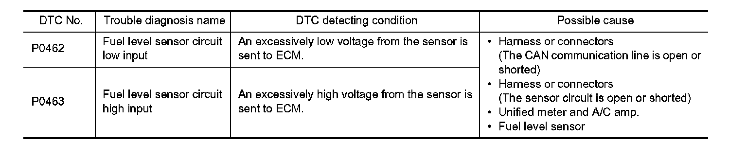 - If DTC P0462 or P0463 is displayed with DTC UXXXX, first perform the trouble diagnosis for DTC