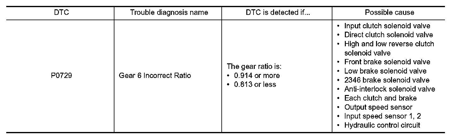 This malfunction is detected when the A/T does not shift into 6GR position as instructed by TCM. This is not only caused by electrical malfunction (circuits open or shorted) but by mechanical malfunction such as control valve sticking, improper solenoid valve operation, etc.