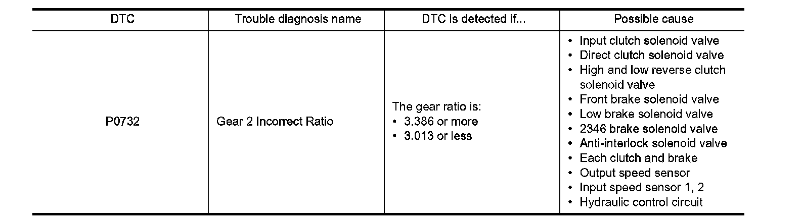 This malfunction is detected when the A/T does not shift into 2GR position as instructed by TCM. This is not only caused by electrical malfunction (circuits open or shorted) but by mechanical malfunction such as control valve sticking, improper solenoid valve operation, etc.