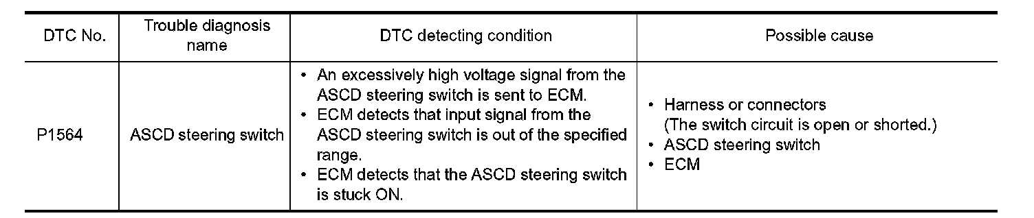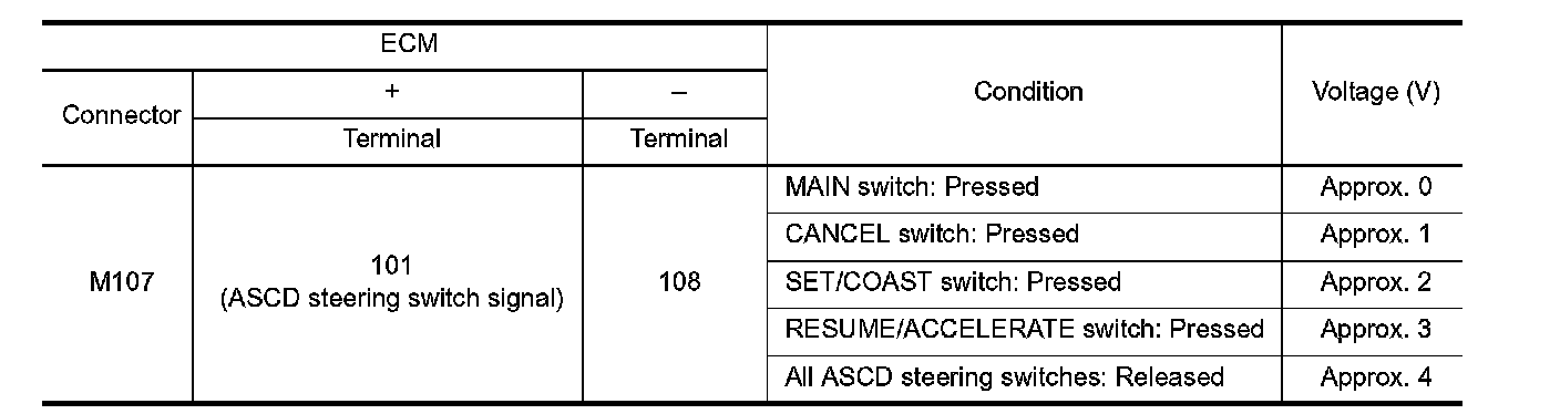 ASCD steering switch has variant values of electrical resistance for each button. ECM reads voltage variation of switch, and determines which button is operated. Refer to System Description for the ASCD function.