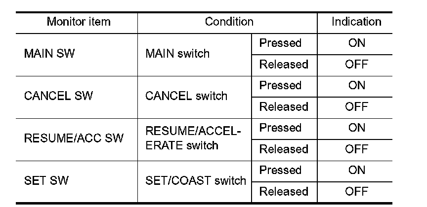 2. Select "MAIN SW", "CANCEL SW", "RESUME/ACC SW" and "SET SW" in "DATA MONITOR" mode with