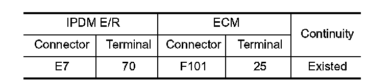 4. Check the continuity between IPDM E/R harness connector and ECM harness connector.