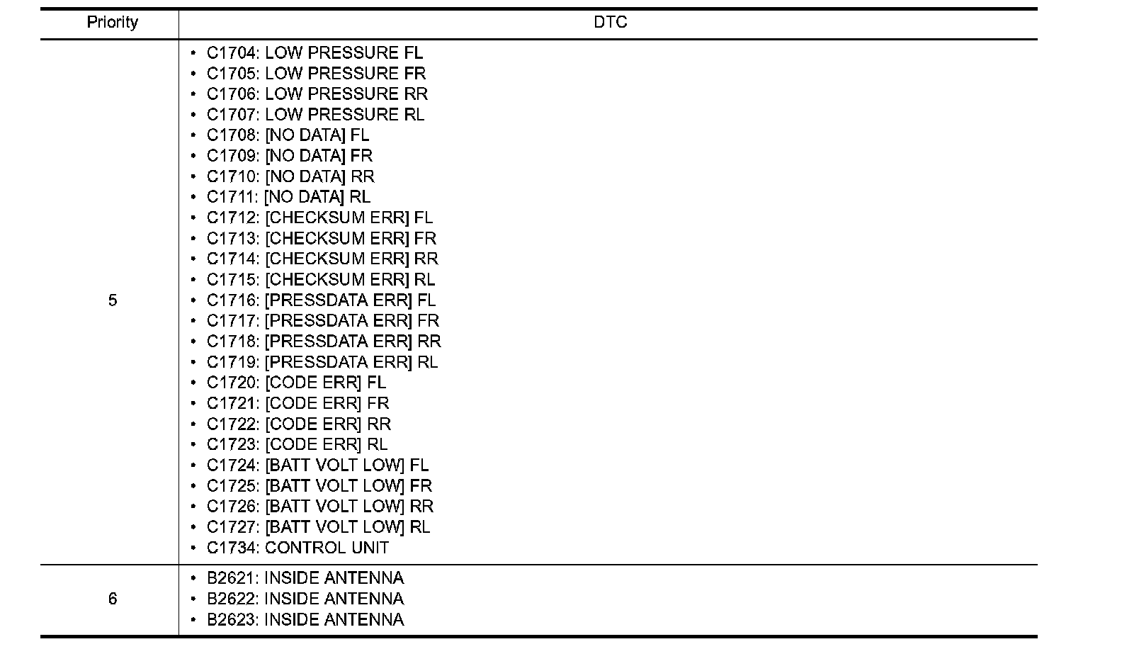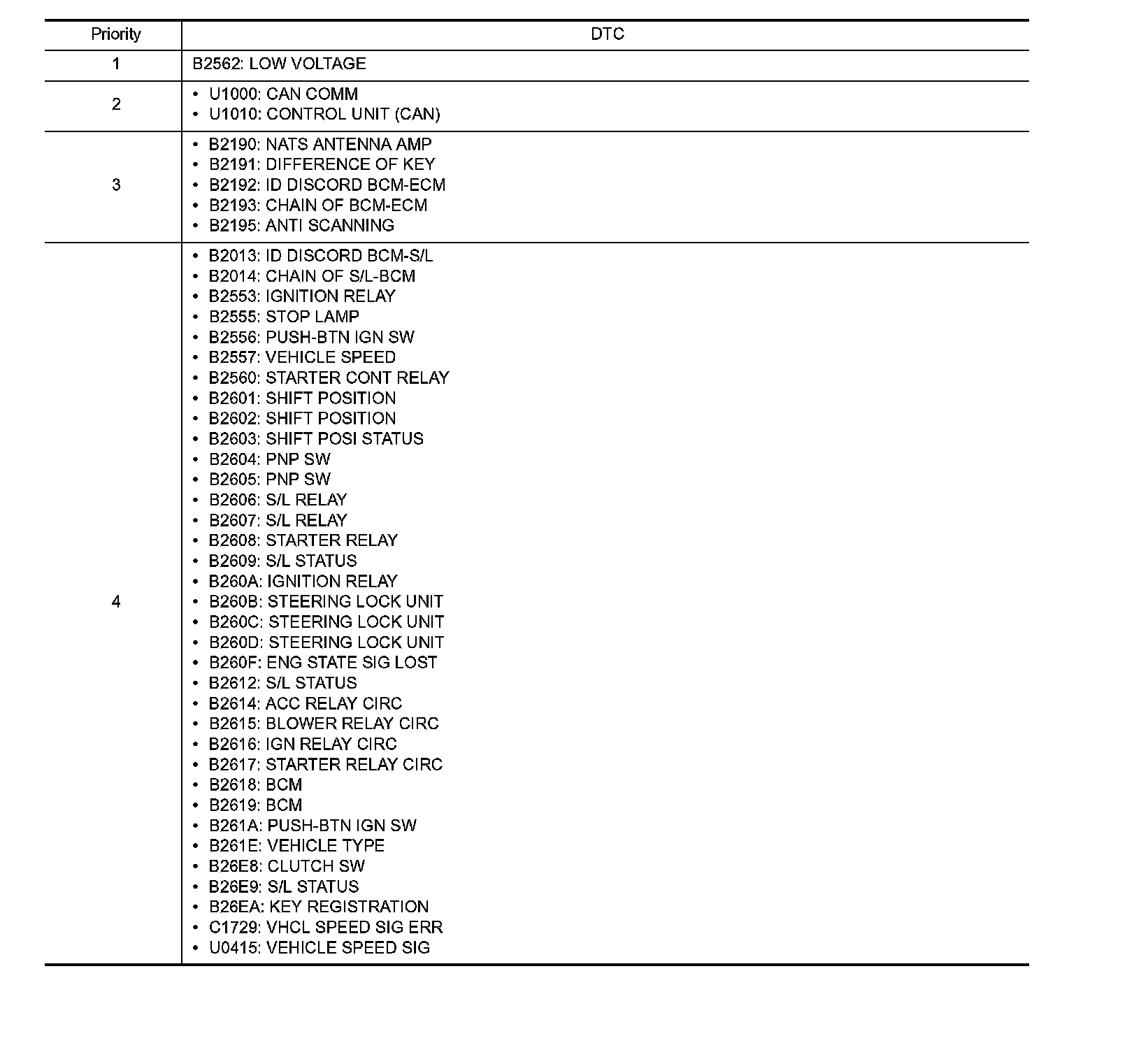 If some DTCs are displayed at the same time, perform inspections one by one based on the following priority chart.