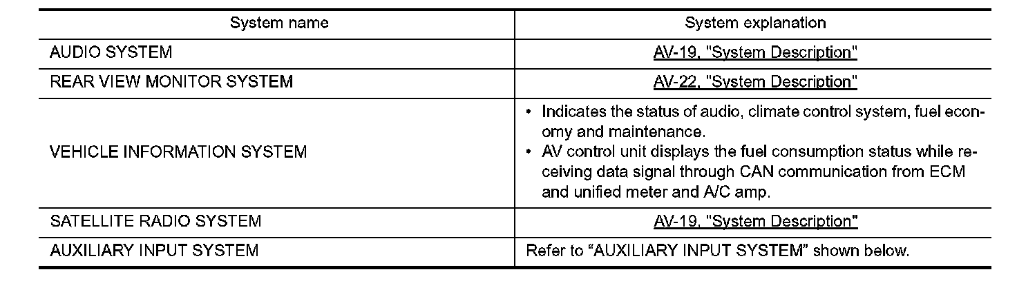 - AV control unit is connected by CAN communication, and it receives data signal from ECM, unified meter and A/C amp. It computes and displays fuel economy information value with the obtained information. Transmitting/receiving of data signal is performed by BCM. Also, it transmits the required signal of vehicle setting and receives the response signal.