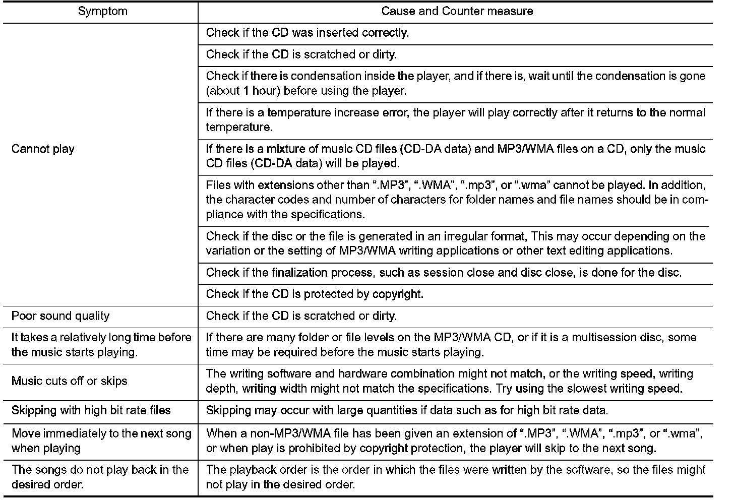 - The majority of the audio malfunctions are the result of outside causes (bad CD/cassette, electromagnetic interference, etc.). Check the symptoms below to diagnose the malfunction.