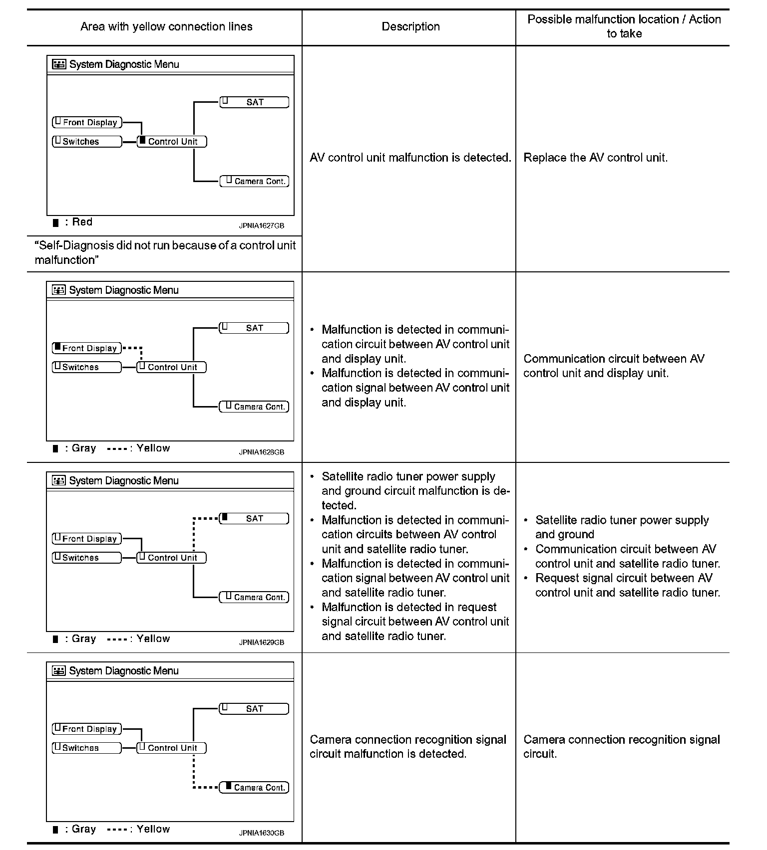 - Self-diagnosis mode performs the AV control unit diagnosis and the connection diagnosis between each of the units that make up the system, and it indicates the results to the display.