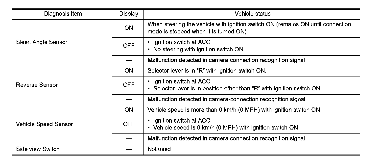 - Because the start condition of diagnosis function is a switch operation, the on board diagnosis function can- not be started up if any malfunction is detected in the communication circuit between AV control unit and multifunction switch.