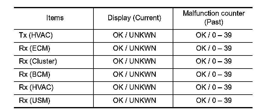 - The error counter displays "OK" if any malfunction was not detected in the past and displays "0" if a malfunction is detected. It increases by 1 if the condition is normal at the next ignition switch