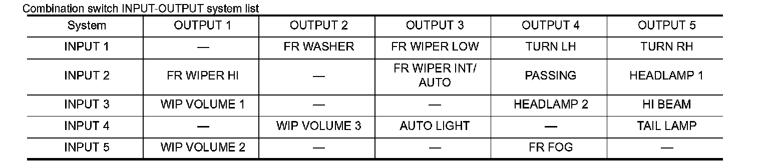 - BCM detects the combination switch status signal "1E" when the signal of OUTPUT 5 is input to INPUT 1.