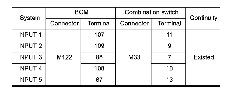 3. Check continuity between BCM harness connector and combination switch harness connector.
