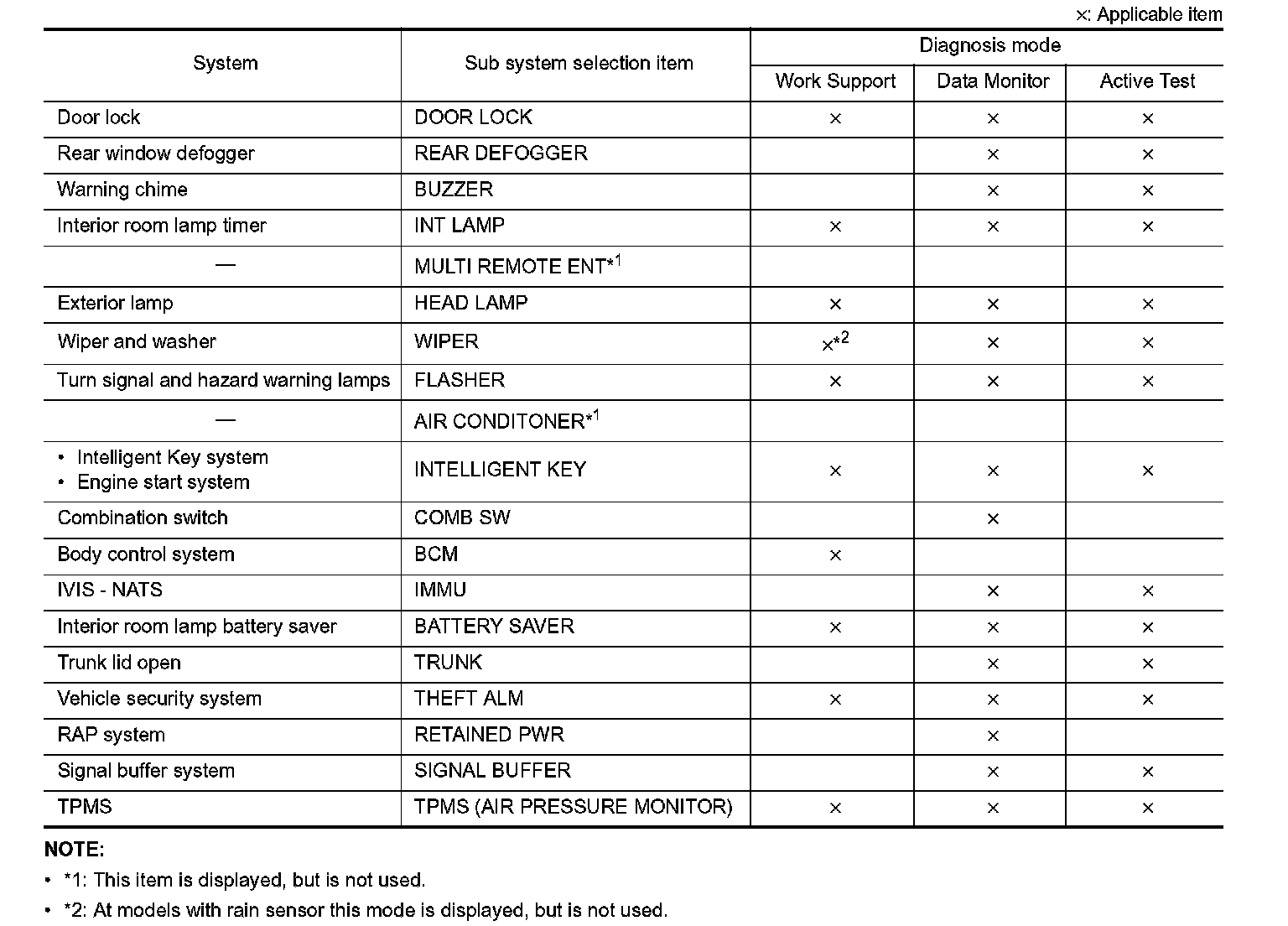 It can perform the diagnosis modes except the following for all sub system selection items.