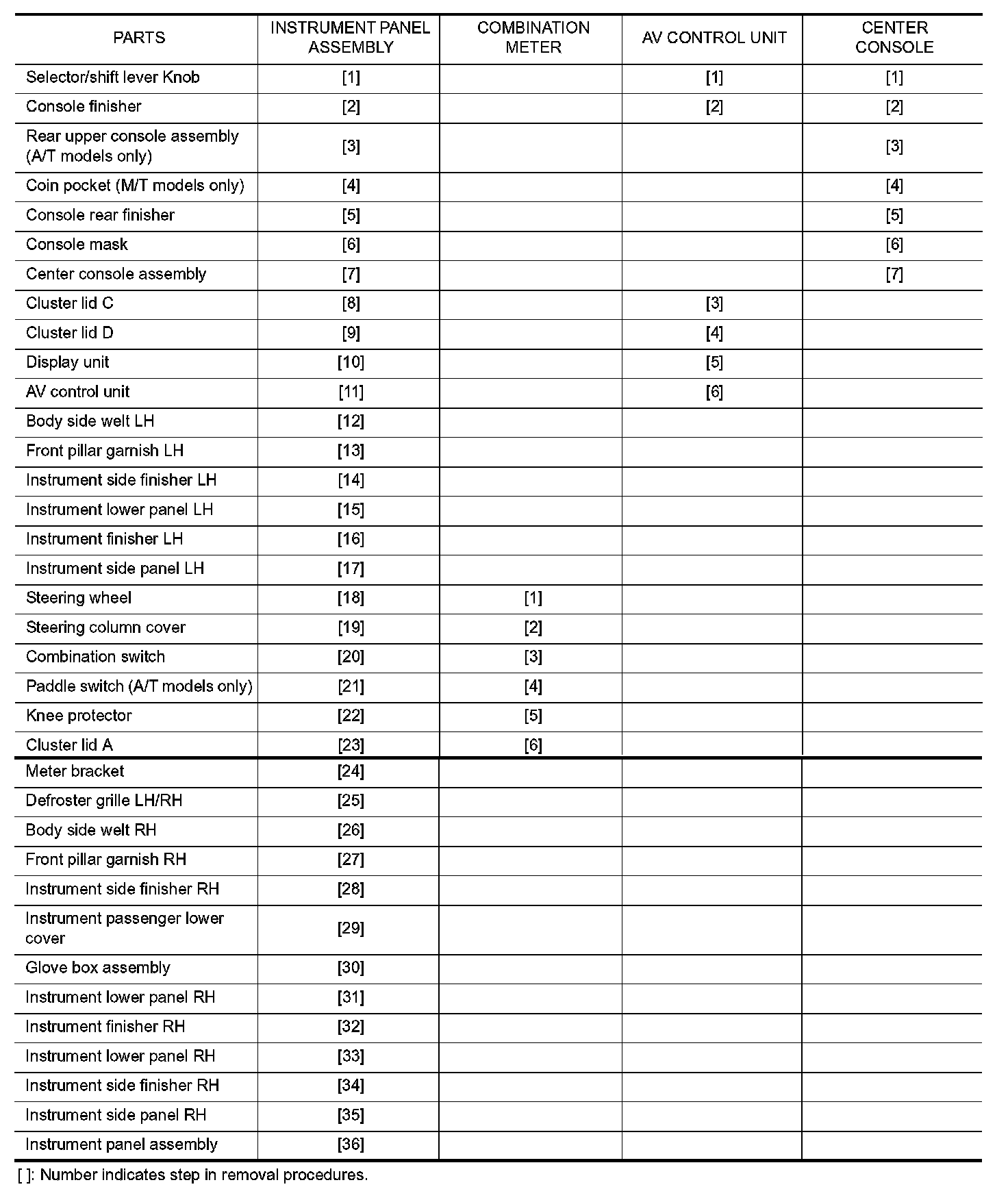When removing instrument panel assembly, combination meter, audio unit, center console take steps in the order shown by the number below.