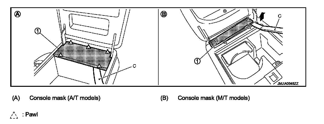 - Pull up console mask (1) by using a remover tool (C), and disengage pawls.