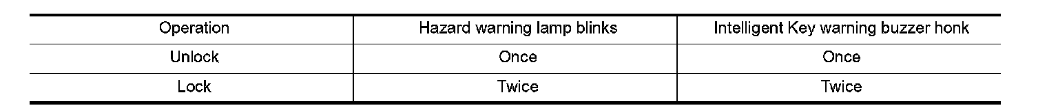 During lock, unlock, operation by each door request switch, the hazard warning lamps and Intelligent Key warning buzzer blinks or honk as a reminder.