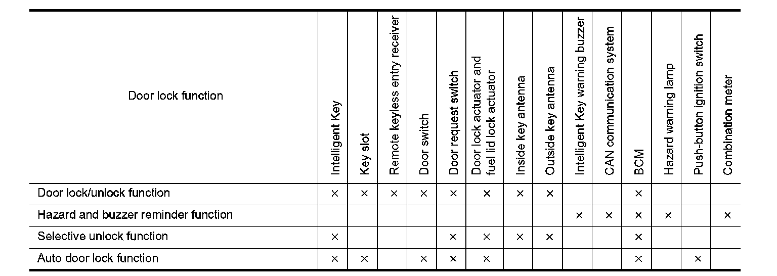 - BCM lock/unlock each door and fuel lid and sounds Intelligent Key buzzer warning (lock: 2 times, unlock: 1 time) at the same time as a reminder.