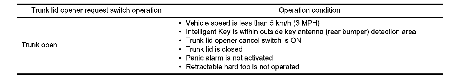 If the following conditions are not satisfied, trunk open operation is not performed even if the trunk lid opener request switch is operated.