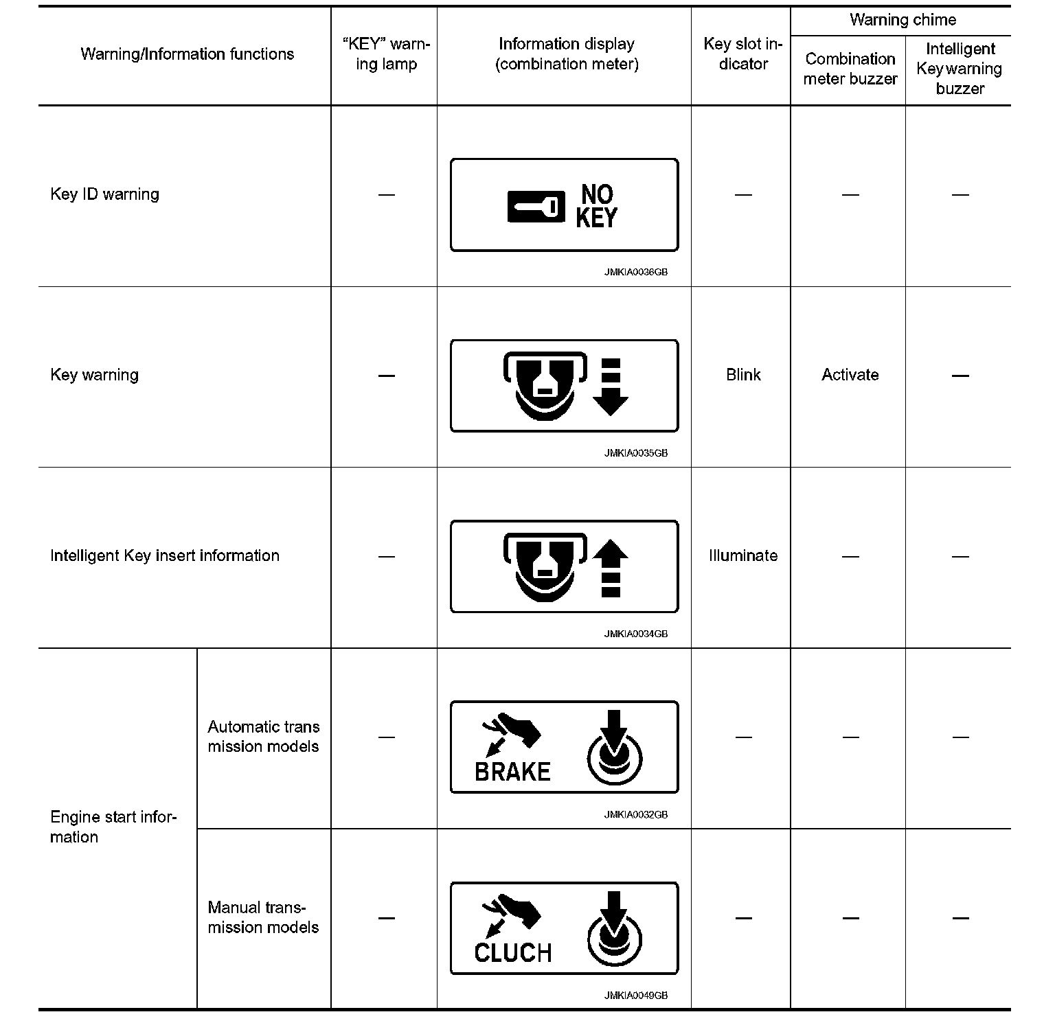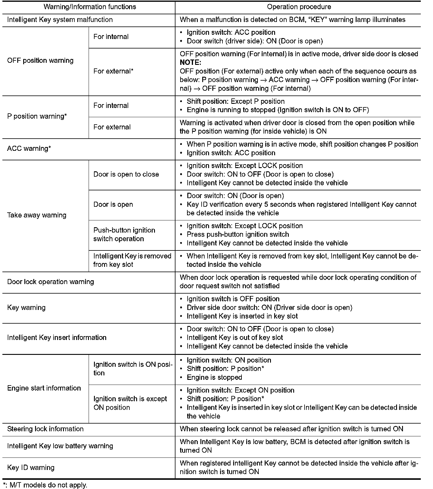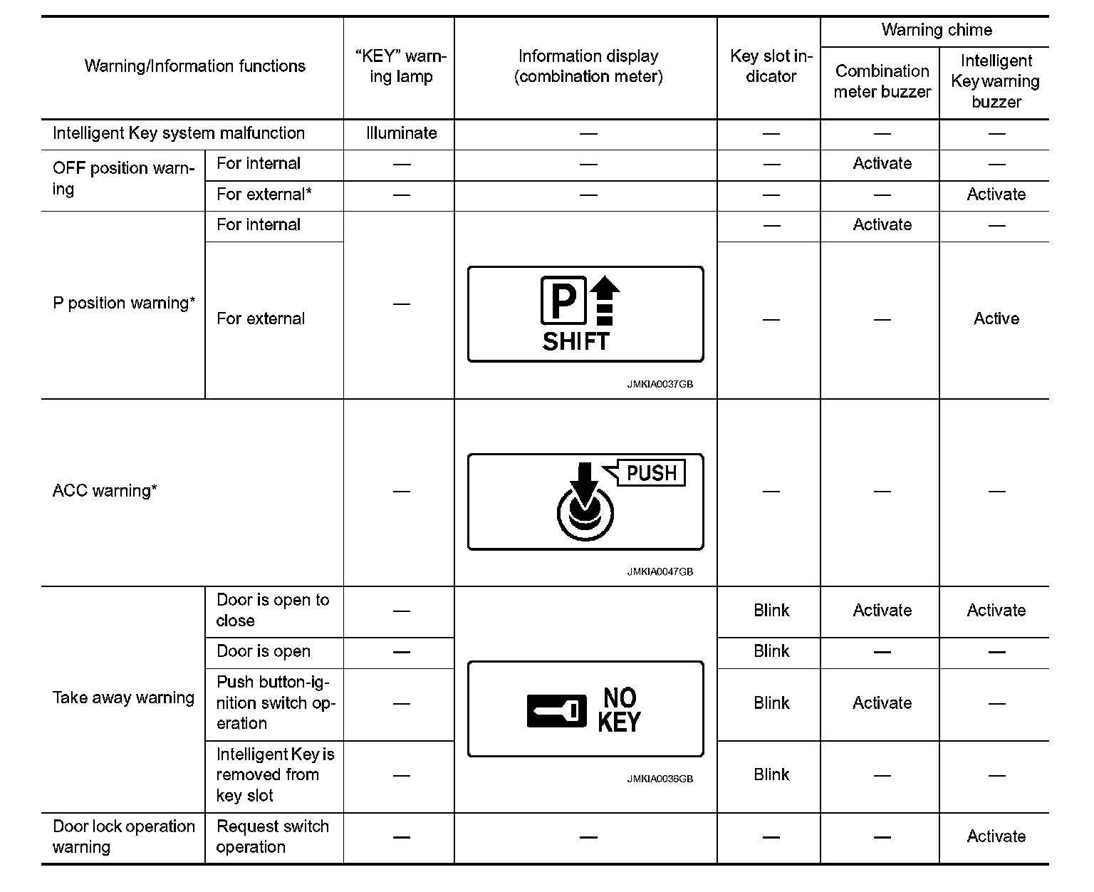The warning function are as per the following items and are given to the user as warning information and warnings using combinations of Intelligent Key warning buzzer, combination meter buzzer, KEY warning lamp, key slot indicator and information display in combination meter.
