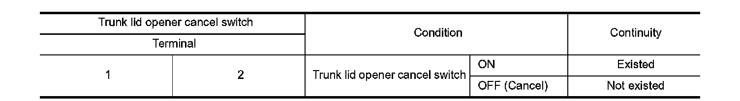3. Check continuity between trunk lid opener cancel switch terminals.