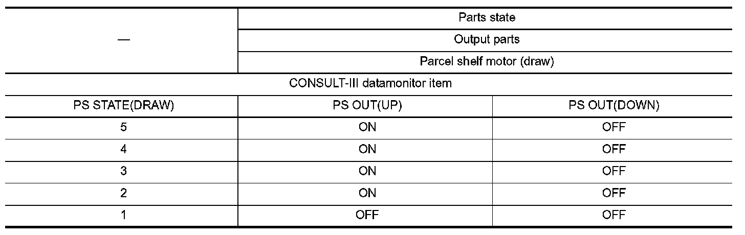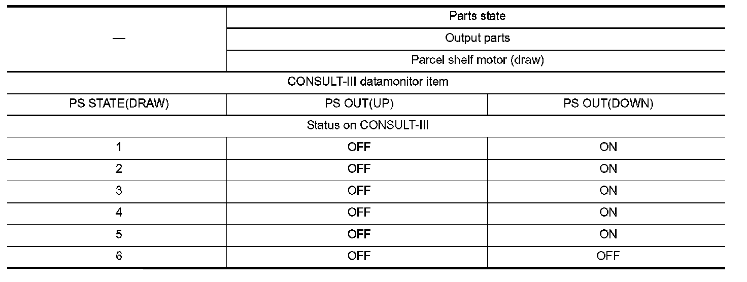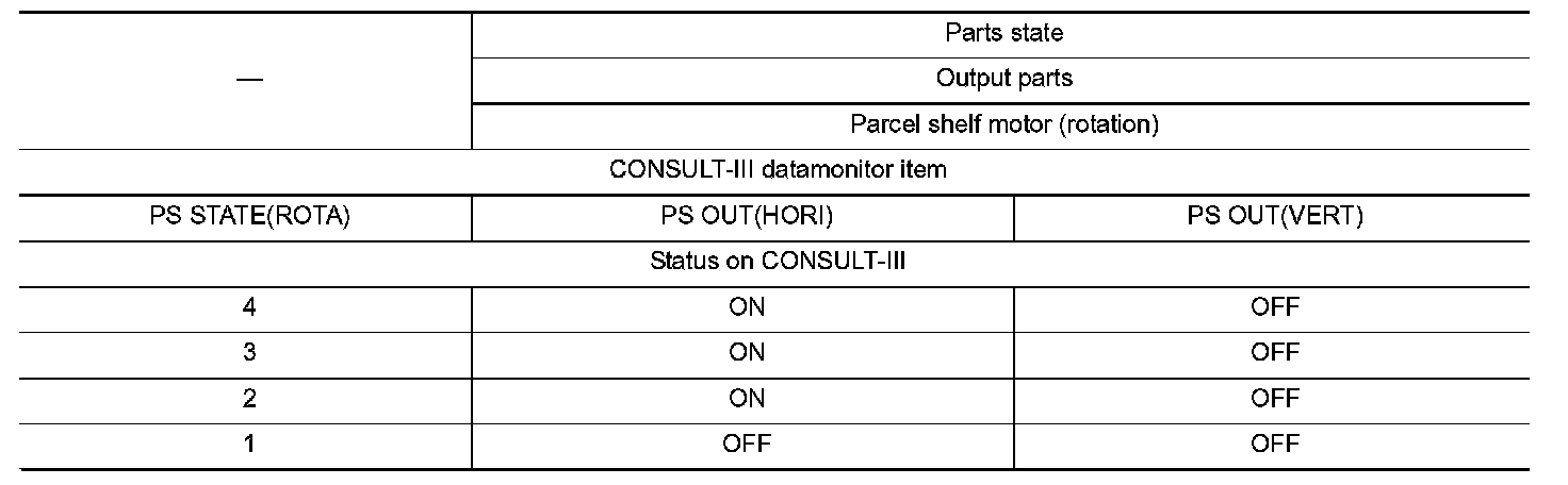 Parts state (CONSULT-III display) according to sequential parcel shelf operations is as shown in the following table.