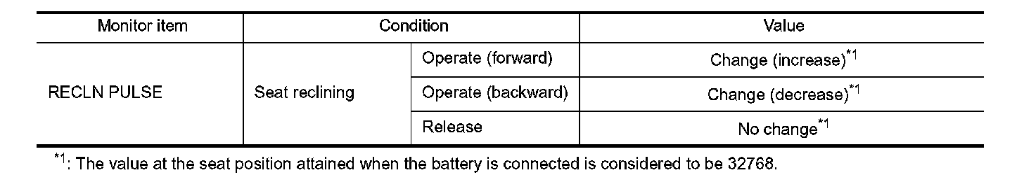 3. Check reclining sensor signal under the following conditions.