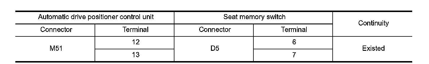 3. Check continuity between automatic drive positioner control unit harness connector and seat memory switch harness connector.