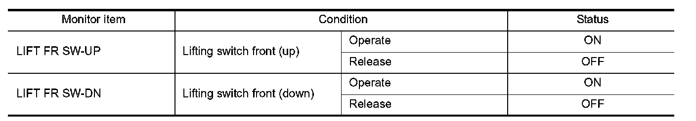 3. Check lifting switch (front) signal under the following conditions.