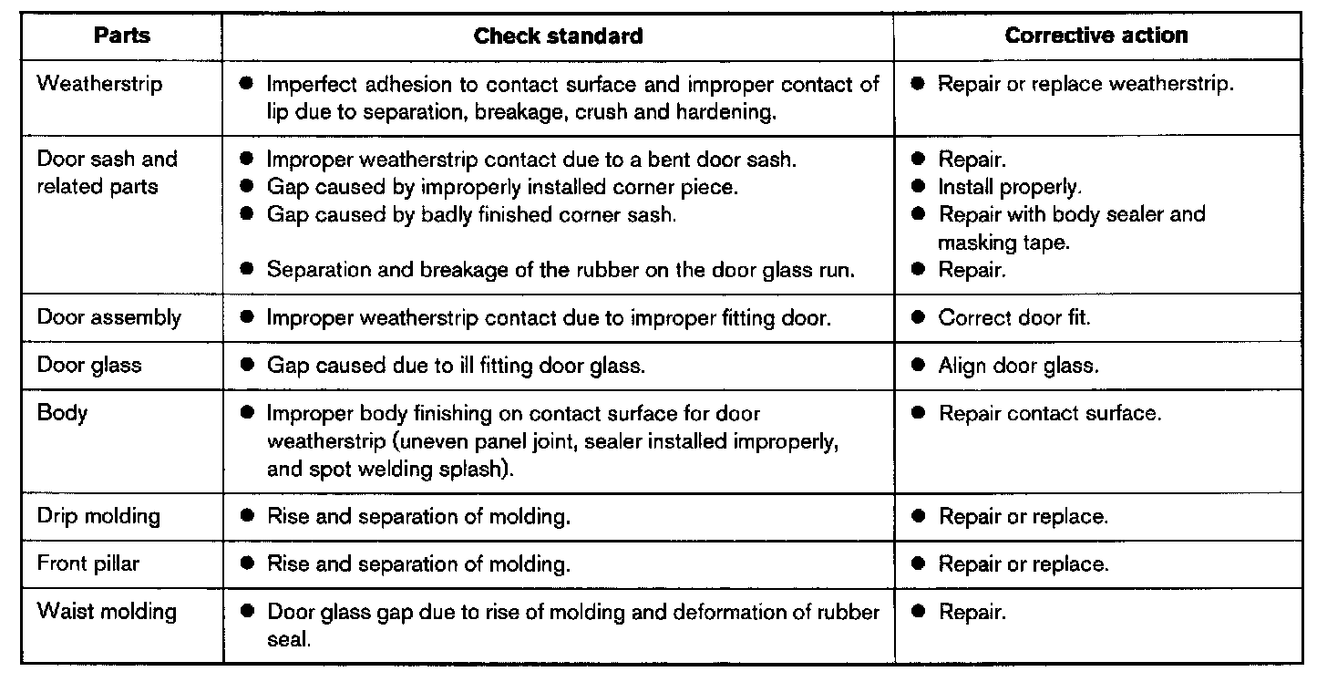 Parts often causing (1) and (2) are the regions around the front pillar, door sash and door glass.