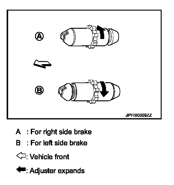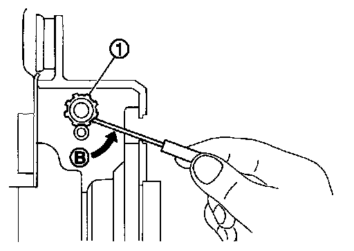 b. Using suitable tool, rotate adjuster (1) in the direction (B) to retract and loosen brake shoe.