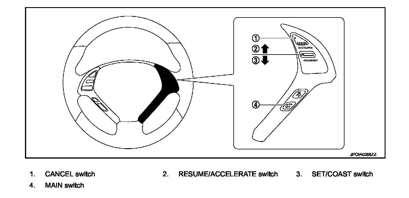 To turn on the vehicle-to-vehicle distance control mode again, turn OFF the system and quickly push (less than 1.5 seconds) the MAIN switch.