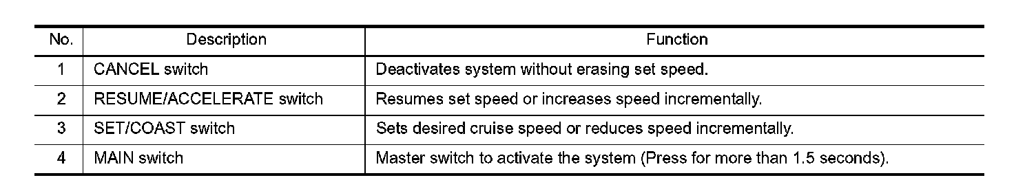 If the system is canceled by conditions 1-7 below, the system will resume control at the last set cruising speed by pushing the RESUME/ACCELERATE switch.
