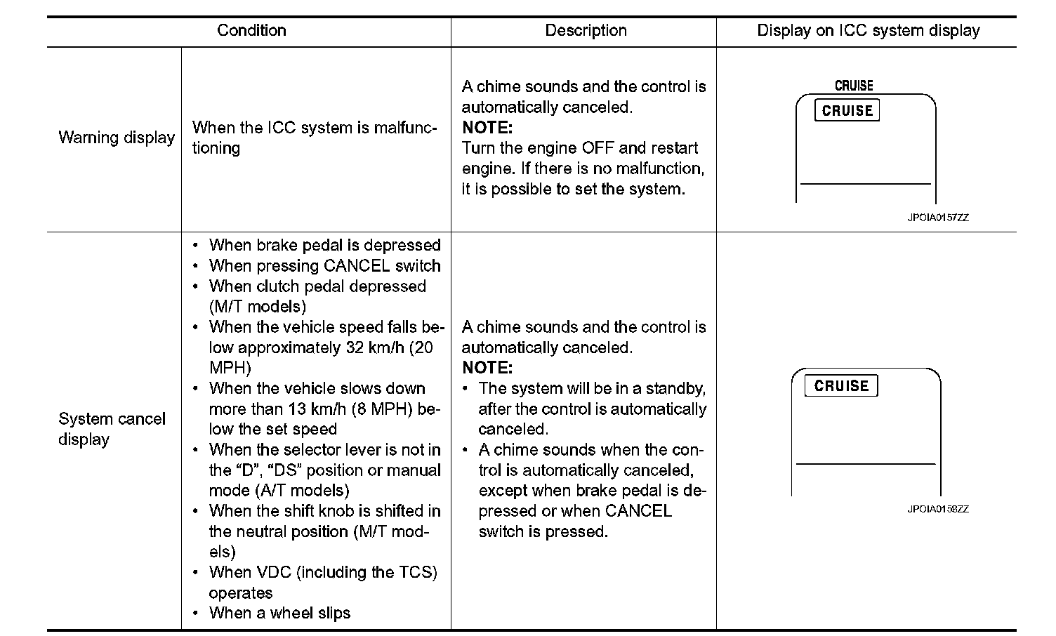 In the conventional (fixed speed) cruise control mode, a warning chime does not sound to warn driver if own vehicle are too close to the vehicle ahead, as neither the presence of the vehicle ahead nor the vehicle-to-vehicle distance is detected.