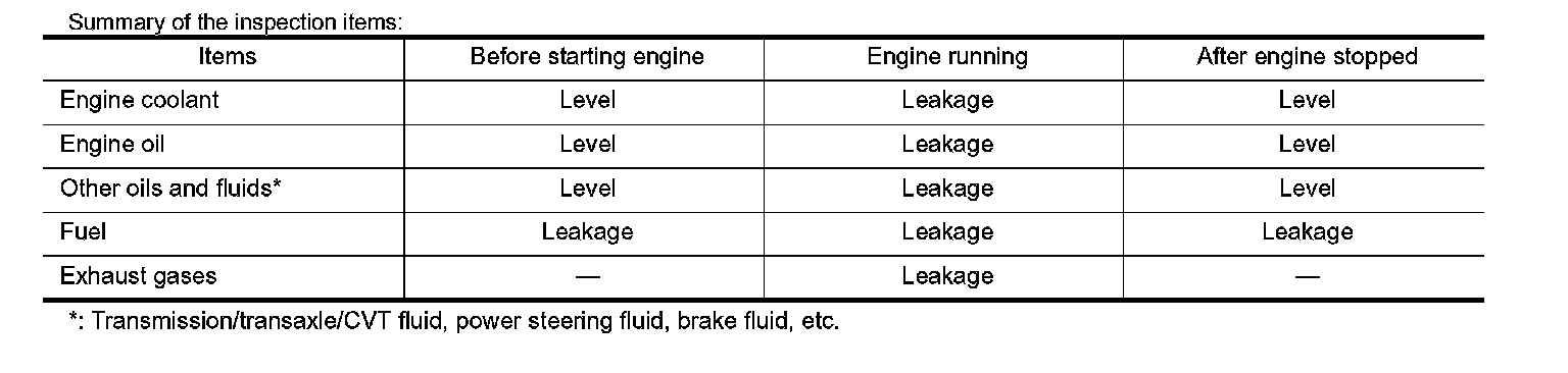 The following are procedures for checking fluid leakage, lubricant leakage.
