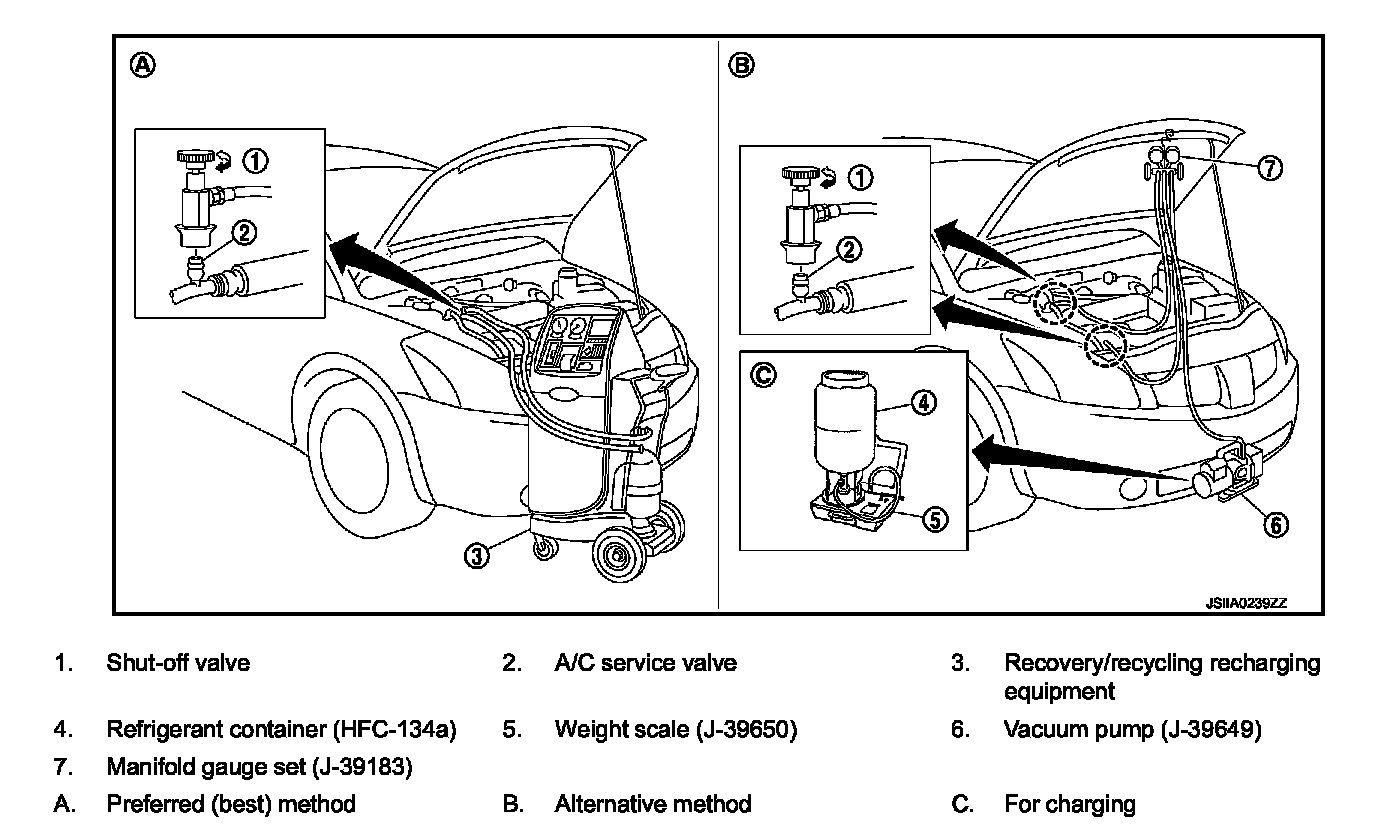 1. Connect recovery/recycling recharging equipment or manifold gauge set (SST: J-39183).