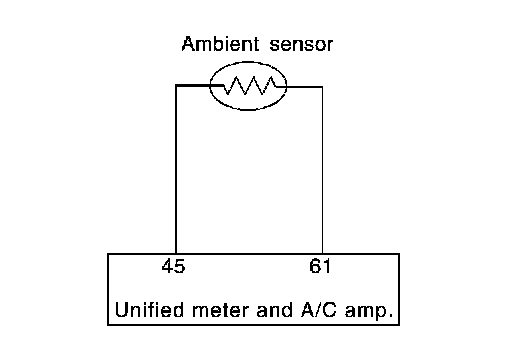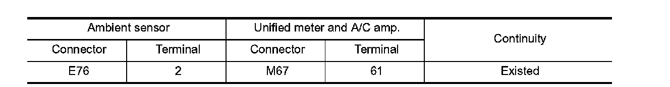 3. Check continuity between ambient sensor harness connector and unified meter and A/C amp. harness connector.