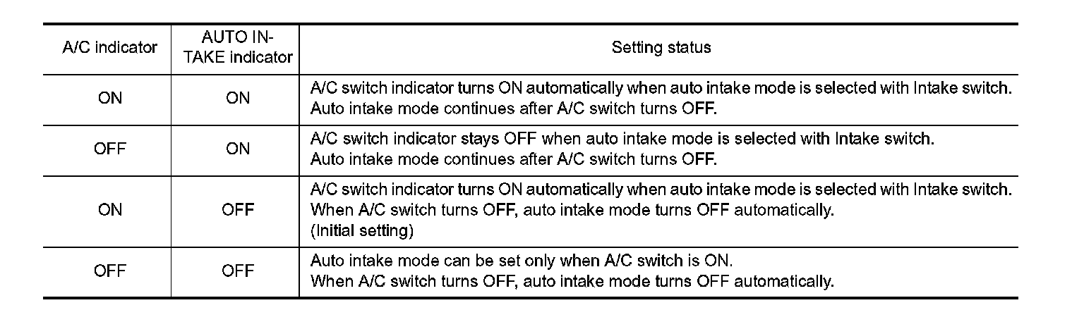 Conditions for interlocking movement of intake switch (auto intake mode) and A/C switch can be changed. In addition, operation of the intake switch, which activates the auto intake control system, can be set to become available when the A/C switch is ON.