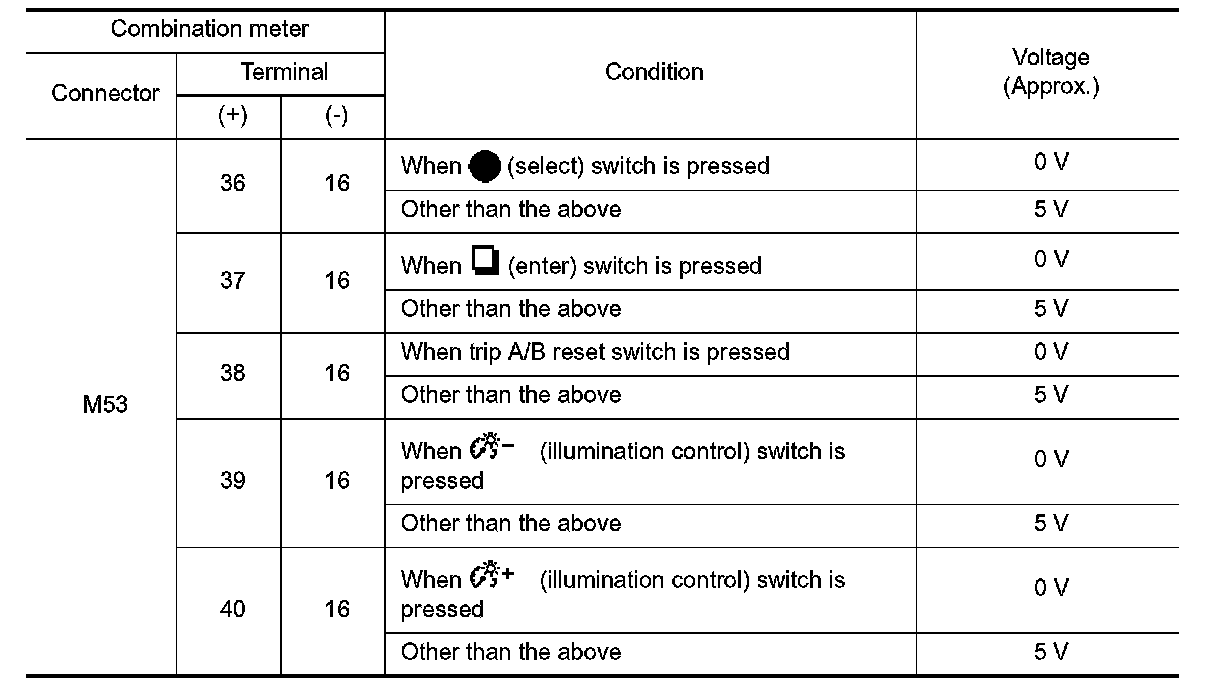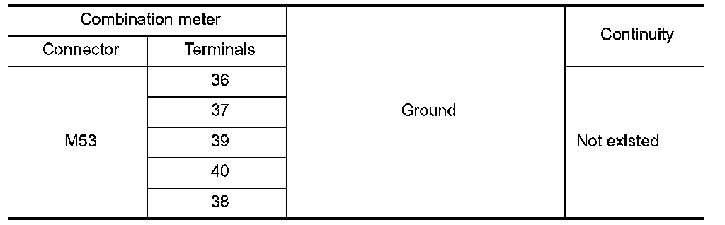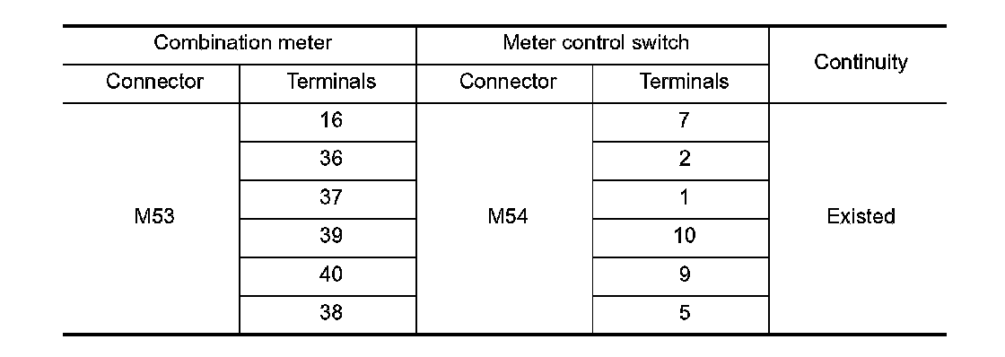 3. Check continuity between combination meter harness connector terminal and meter control switch harness connector terminal.