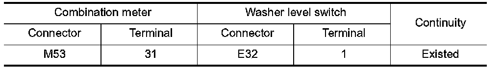 3. Check continuity between combination meter harness connector terminal and washer level switch harness connector terminal.